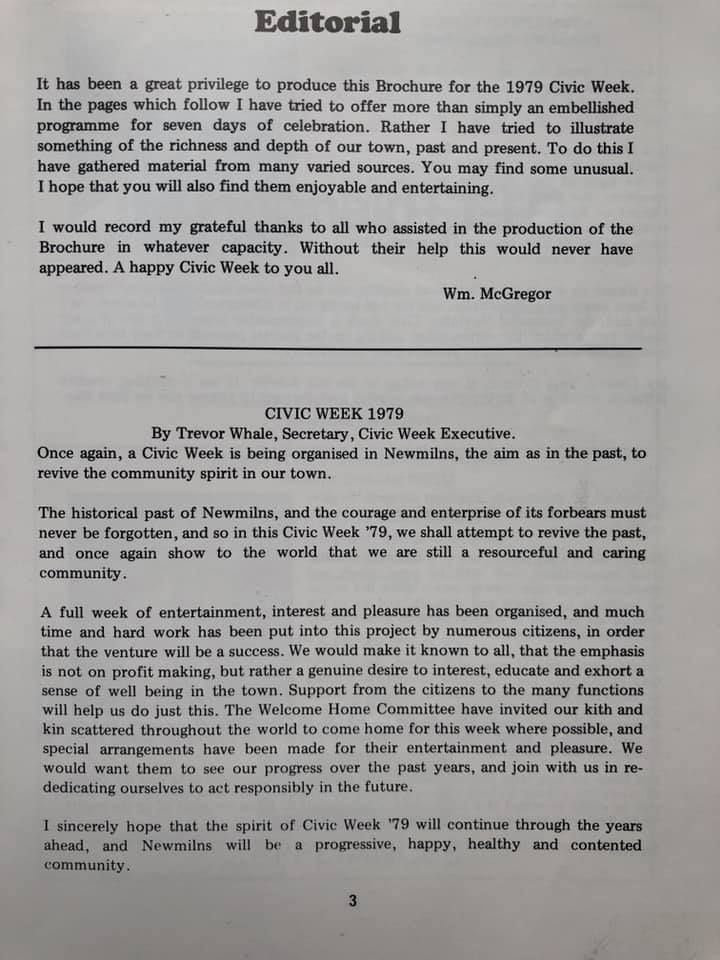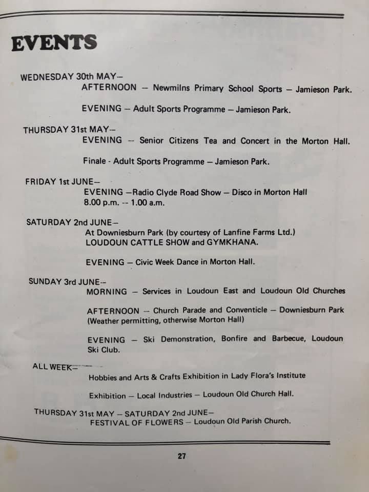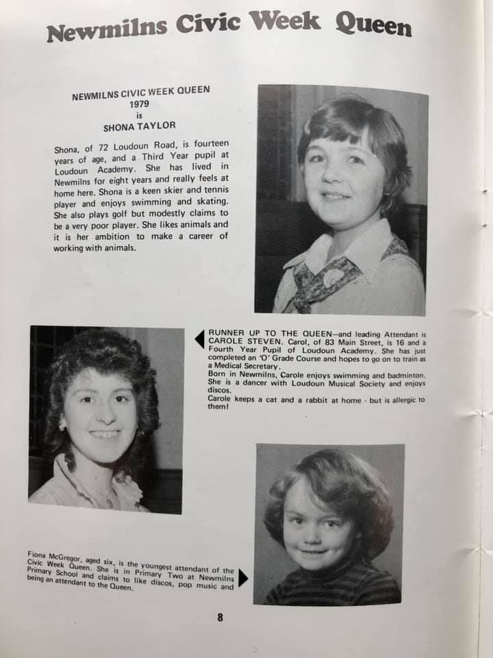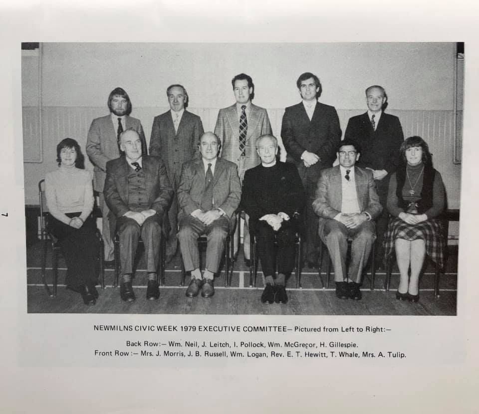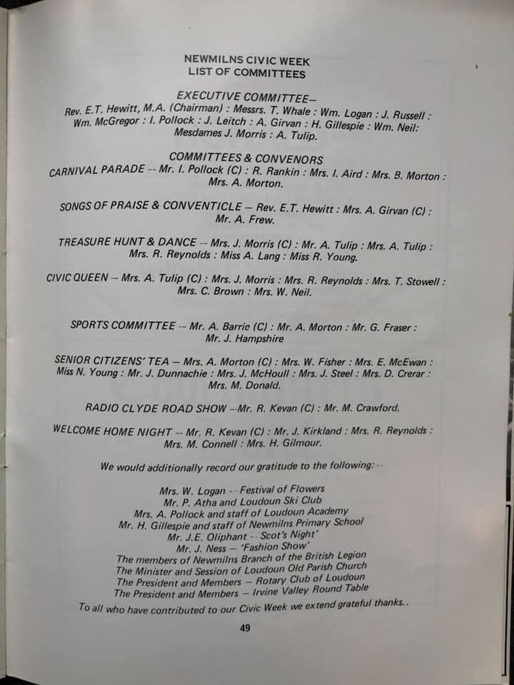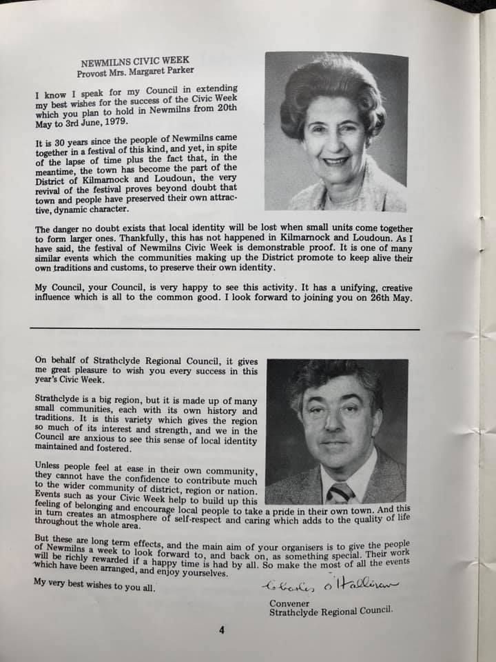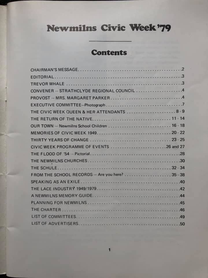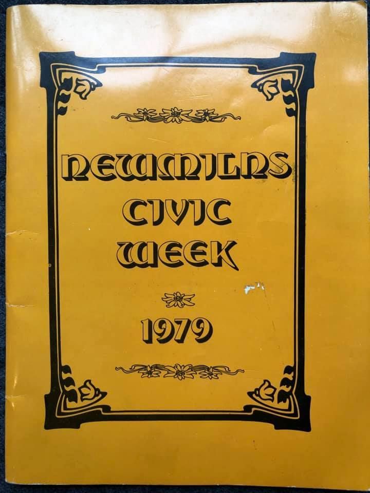 A copy of the official programme for Newmilns Civic Week 1979, including Chairman's message from Rev. E.T. Hewitt, M.A., photos of the civic queen and her attendants, contributions from the children of Newmilns School, images of the flood of 1954, some old school photos, a piece on the lace industry 1949/1979, list of committees and advertisers.