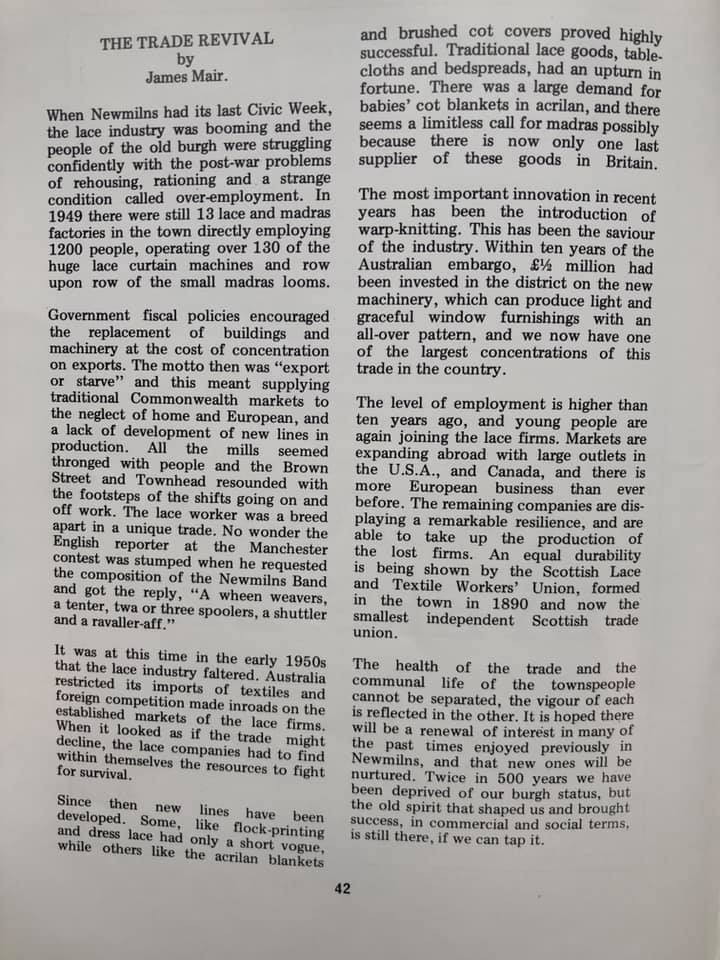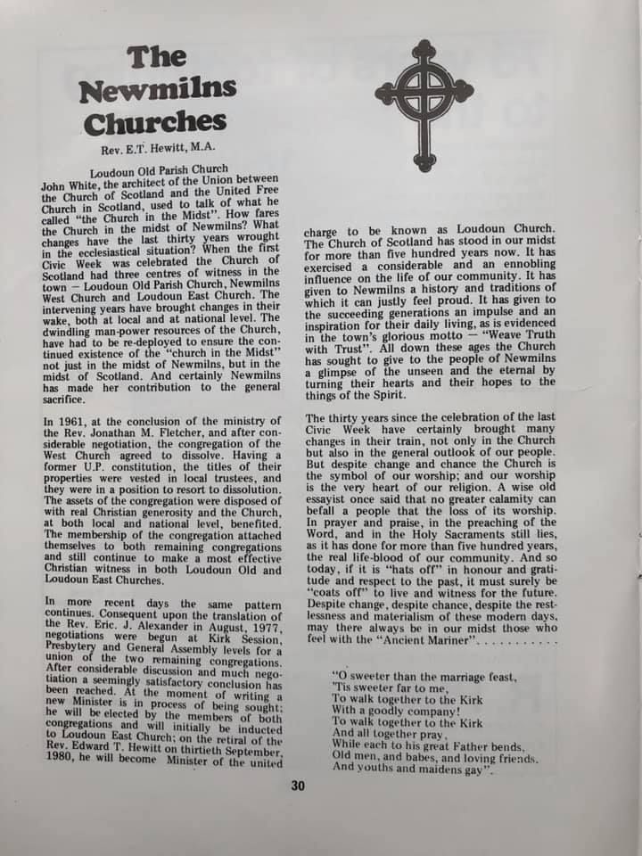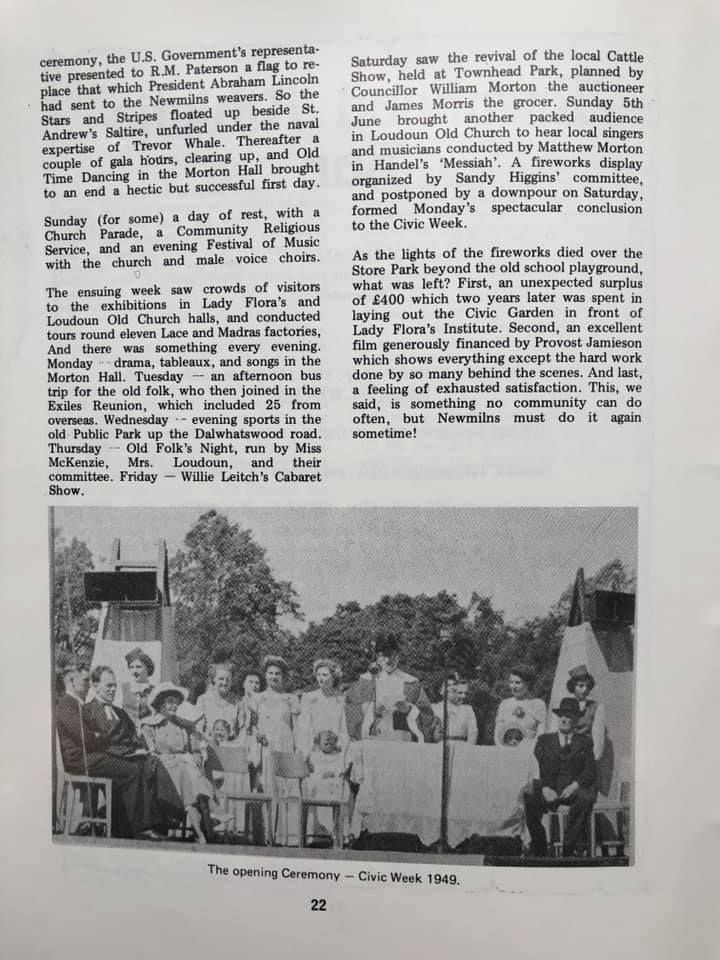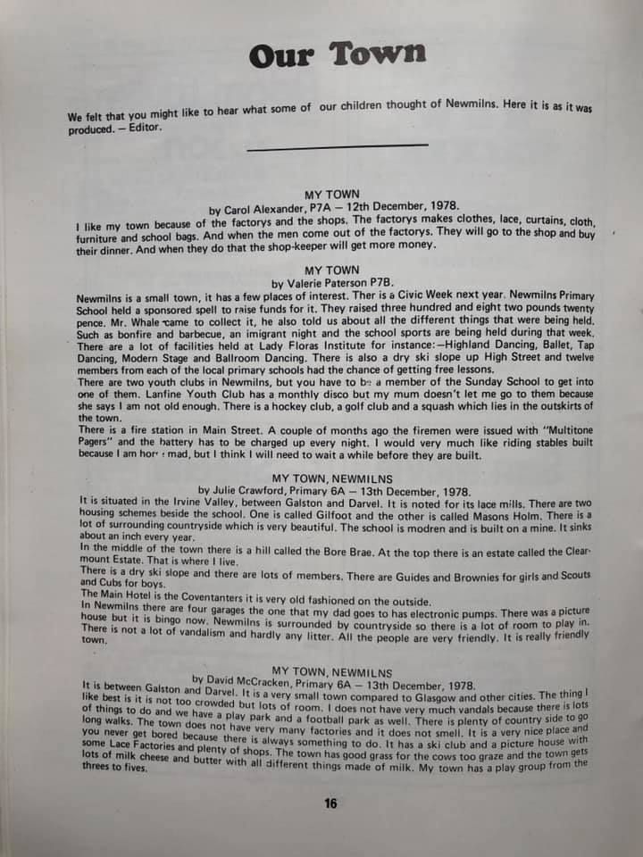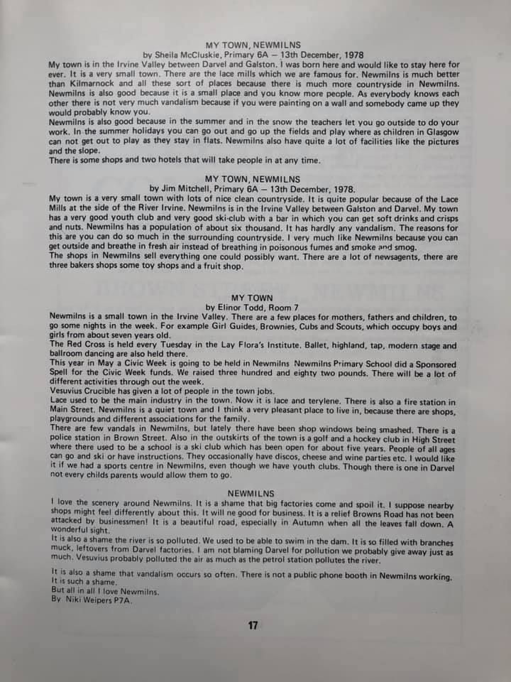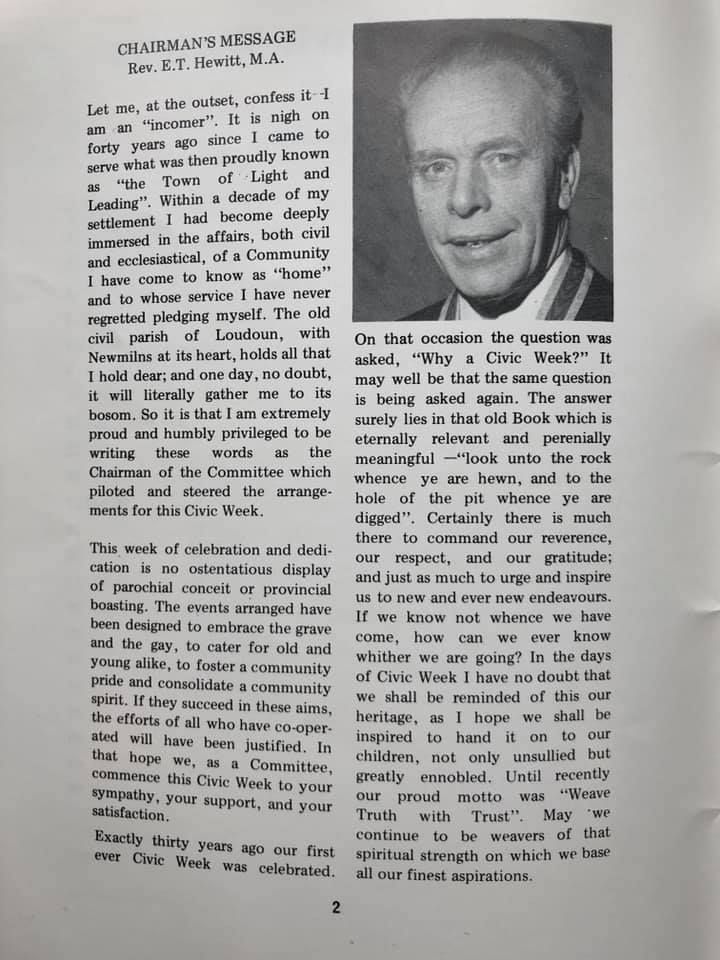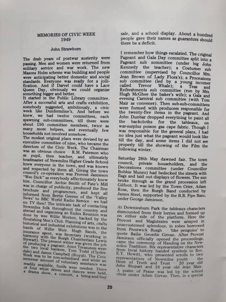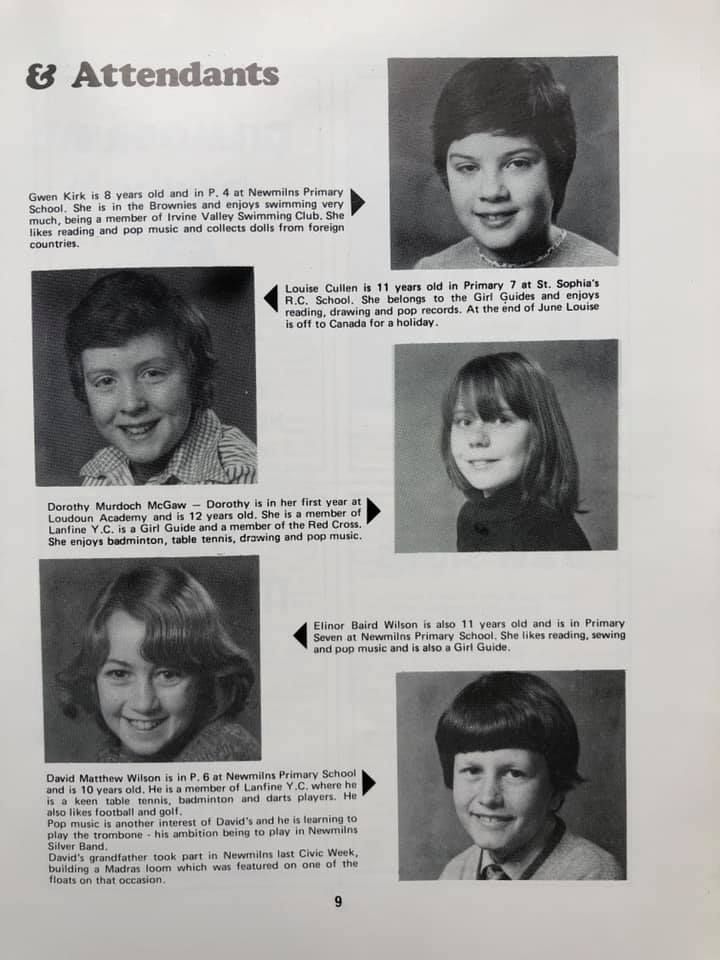 A copy of the official programme for Newmilns Civic Week 1979, including Chairman's message from Rev. E.T. Hewitt, M.A., photos of the civic queen and her attendants, contributions from the children of Newmilns School, images of the flood of 1954, some old school photos, a piece on the lace industry 1949/1979, list of committees and advertisers.