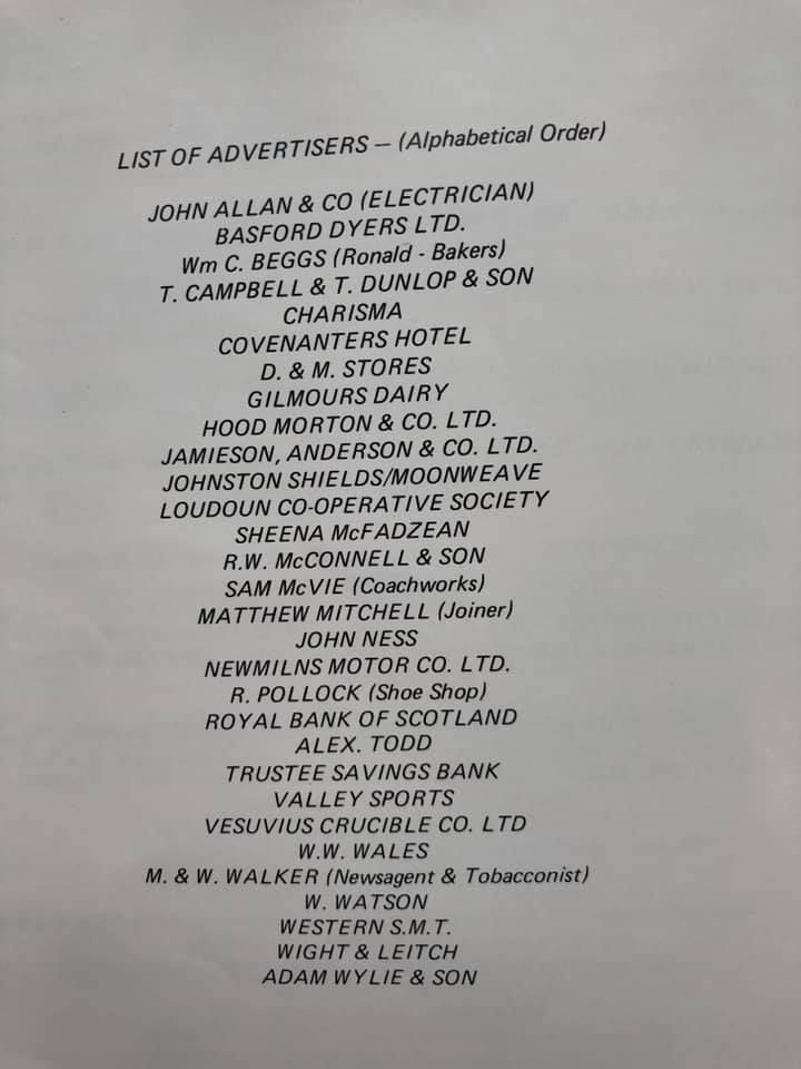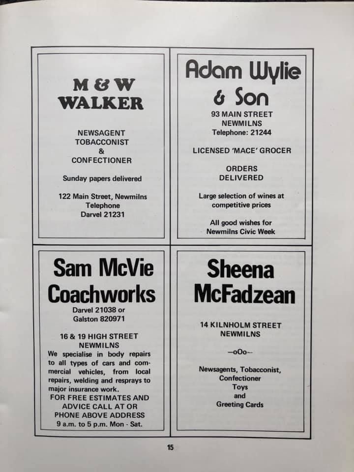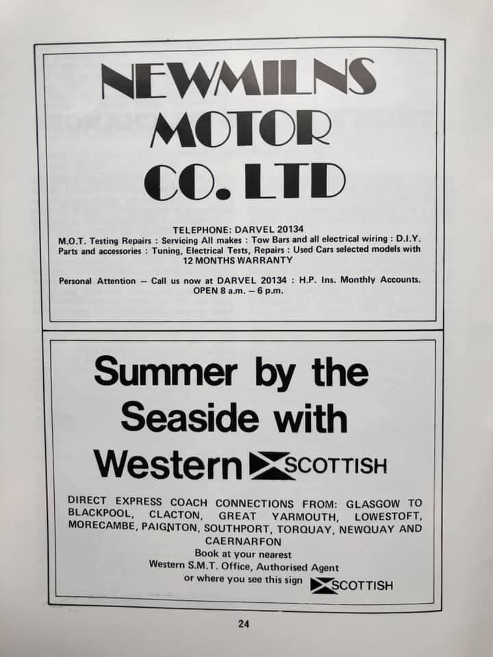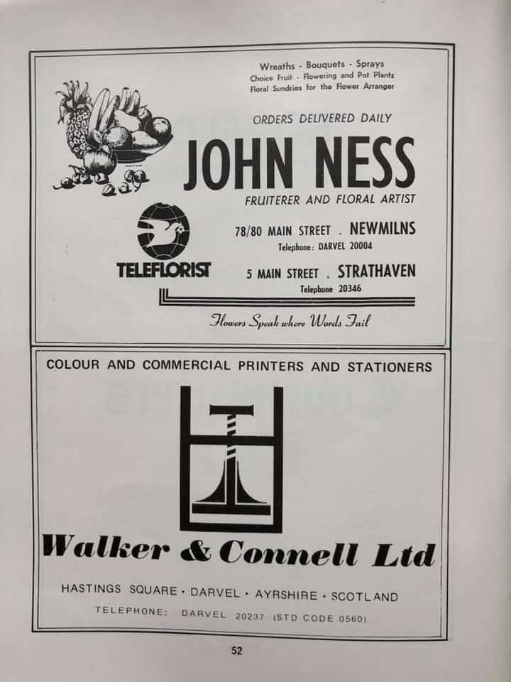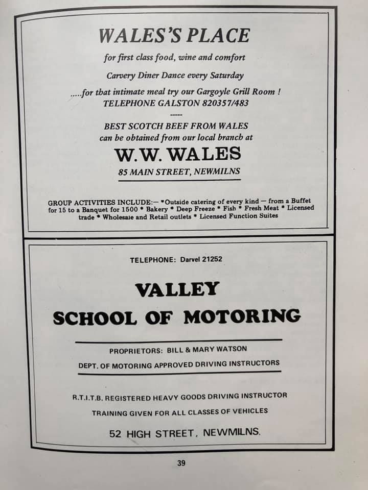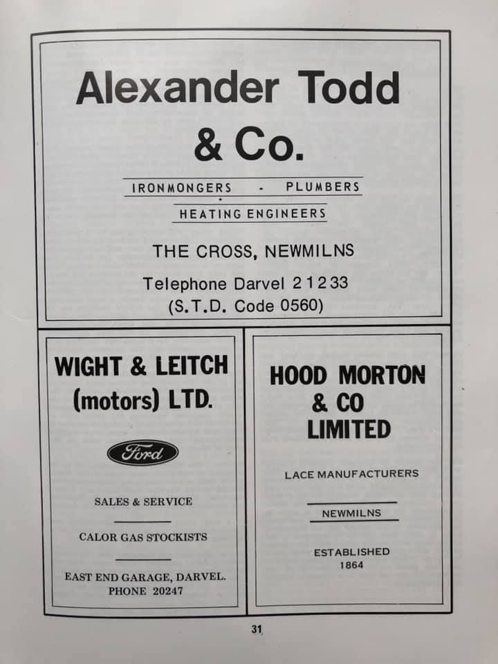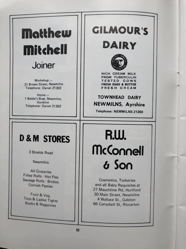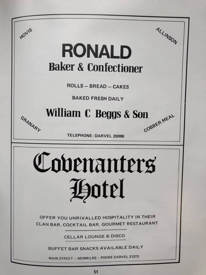 Some interesting adverts for local businesses including the Covenanters Hotel, Gilmours Dairy, Wm C. Beggs (Ronald-Bakers), R. Pollock Shoe Shop, Vesuvius Crucible, Weight & Leitch and Adam Wylie & Son - remember them?.