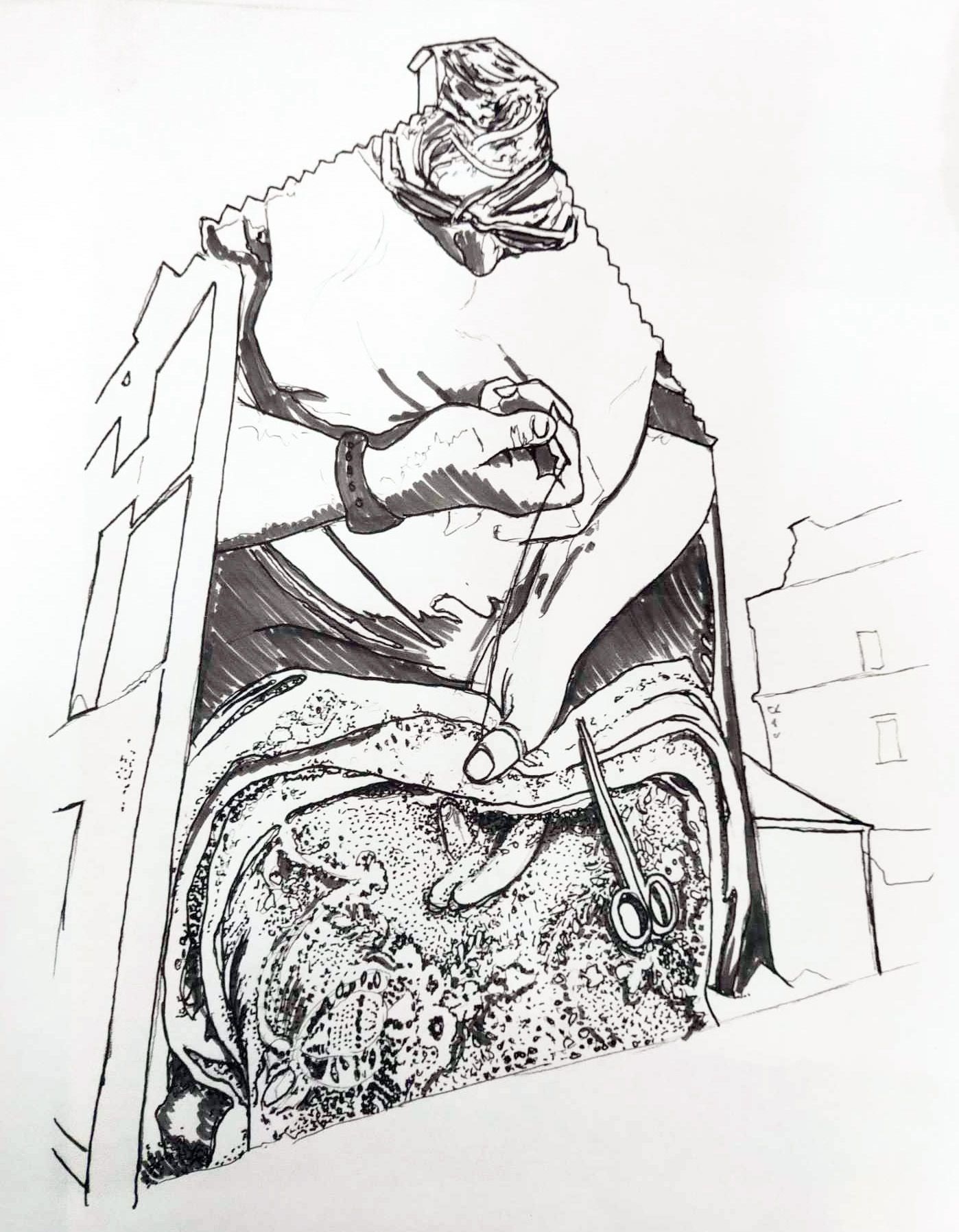 Taken from a recent photograph at MYB Textiles, depicting a hand darner carrying out inspection and repair of the lace panels, whilst sitting on a low wooden stool. This process is still carried out today, on the same type of low wooden stool used for over 120 years. The design concept presented below is based on a photograph of long-standing MYB Textiles employee Janey Gray, who is set to retire next year after 26 years of dedicated service to the company.